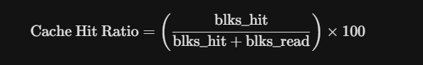 It is fundamental to measure efficiency in PostgreSQL. The query below serves to calculate the Cache Hit Ratio. If the value is less than 99%, your shared_buffers might be undersized for the current load: